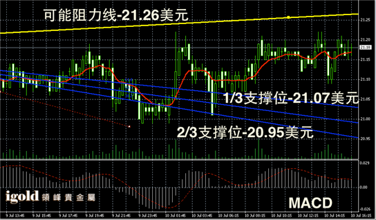 白银阴阳烛录得短线阴阳烛参差不齐,阳烛十字星接连出现,多次冲击21.2美元未果,短线MACD显示弱势多头主导,白银价格或继续小幅攀升。