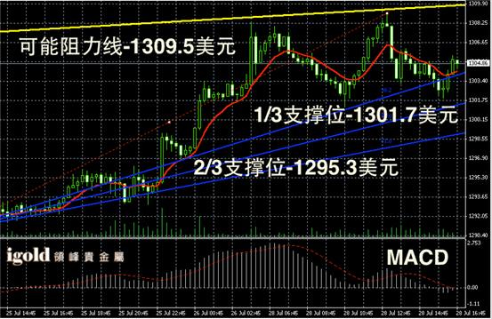 黄金阴阳烛录得短线整体持平,阴阳烛间隔交叉于红色日均线中位,短线MACD显示呈中性,未来黄金价格若不能持稳1304美元,或继续向1300美元支撑线下行。