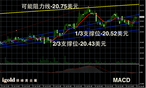 白银阴阳烛录得已经小幅跌破了Fibonacci扇形线,短线MACD呈中性,柱体录得较短,且高低起伏,未来白银价格或在20.6美元线附近持稳,不过整体或向20.5美元线滑落。