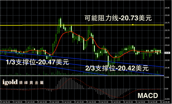 白银阴阳烛录得回落后来到此前的区间中位震荡,显示20.5美元附近的支撑,短线MACD显示呈中性,白银价格或继续在20.5-20.6美元区间偏空运行。