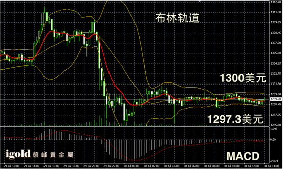 黄金阴阳烛录得布林轨道收平,且上下均线录得距离收短,短线MACD显示呈中性,未来金价或继续在1299美元附近持稳,下午或有小幅反弹,向1302美元附近突破。