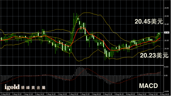 白银阴阳烛录得布林轨道继续攀升,且轨道区间小幅扩大,中线也继续上扬,下午白银价格或不断冲击20.4美元,若持稳则可能向20.5附近攀升。