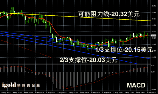白银阴阳烛录得走势趋平,柱体录得较短,且整体处于红色日均线中位,短线MACD显示弱势多头主导,白银价格或继续在20.3美元附近持稳。