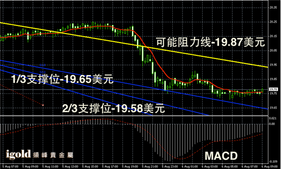 白银阴阳烛录得下行趋势明显,阴烛增多,且短线MACD显示空头主导,白银价格目前跌破了20美元线,且跌幅较大,或首先在19.7-19.8美元区间回调。