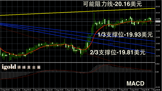 白银阴阳烛录得反弹后,柱体收短,且阴阳烛间隔出现,处于红色日均线中位,短线MACD显示弱势多头主导,白银价格或在20美元附近持稳,白银价格仍然有部分反弹空间。