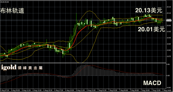 白银阴阳烛录得布林轨道中线小幅收跌,后期阴烛增多,短线MACD显示呈中性,未来白银价格或不断测试20美元线,跌破可能继续走跌至19.9美元附近。
