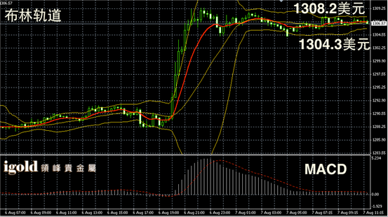 黄金布林轨道录得收窄,上中下三个均线都录得收平,短线MACD显示呈中性,未来金价或在1305美元附近持稳,不过下午伴随美指的攀升,金价或小幅下探1302美元附近。