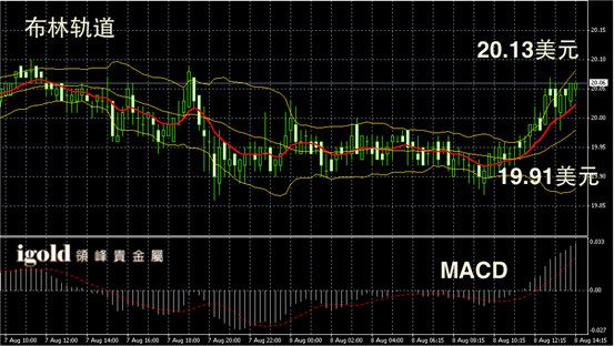 白银布林轨道也有所收涨,阳烛录得高于均线系统,短线MACD显示多头主导,白银价格或继续看涨至20.13美元附近。