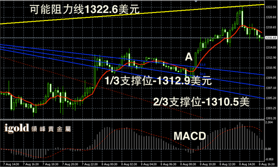 黄金阴阳烛录得反弹后,末端阴烛增多,且低于红色日均线,短线MACD显示弱势多头主动,黄金价格在1315美元附近盘整后,或继续向1320美元附近攀升。