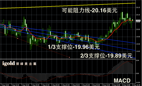 白银阴阳烛录得反弹后,小幅回落,后期阴烛增多,短线MACD显示多头主导,白银价格或继续上扬冲击21美元。