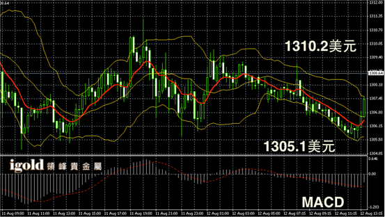 黄金阴阳烛录得布林轨道转跌为升,中线指标上扬,且后期阳烛录得增多。同时短线MACD显示多空轮转,黄金价格下午或继续持稳,并向1310美元附近冲击。
