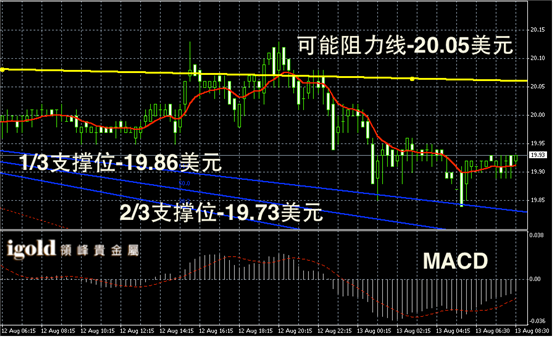 白银阴阳烛录得阴烛增多,且后期低于红色日均线,短线MACD显示弱势空头主导,后期白银价格或多次下探测试19.9美元。