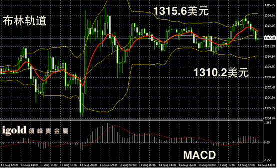 黄金阴阳烛录得布林轨道变宽,显示振幅扩大,同时中线高低起伏,整体表现为波段整理,未来金价或继续在1310–1315美元区间盘整,投资者可在此区间逢低看多,或高位看跌均可。