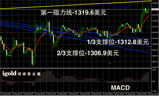 黄金阴阳烛录得阳烛增多,且后期柱体高于红色日均线,短线MACD显示多头主导,黄金价格或首先在1315美元持稳,随后或向1318美元附近反弹,不过后期或回落继续围绕1316美元整理。