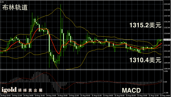 黄金阴阳烛录得小幅高于红色日均线,布林轨道有所变宽,不过整体仍然收平,下午金价或小幅上探至1315美元附近,不过最终或小幅回落至1313美元上下徘徊。