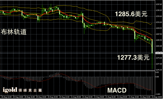 黄金阴阳烛录得阴烛较多,且布林轨道中线下行,短线MACD显示空头主导,下午金价或首先在1279美元附近持稳,且偏于向1282美元附近回调,不过需要留意1278美元线,一旦跌破则可能继续下行。