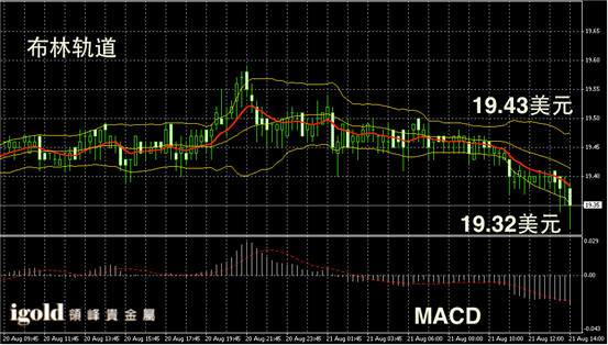 白银阴阳烛录得柱体低于红色日均线,布林轨道录得下行,不过轨道区间仍然较窄,短线MACD显示弱势空头主导,白银价格或小幅下探19.3美元附近后,向19.4美元处回调。