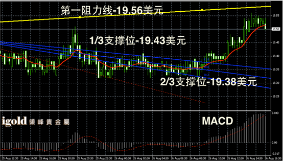 白银阴阳烛录得反弹后,阴烛增多,小幅回落至红色日均线中位,短线MACD显示多头主导,白银价格或继续围绕19.5美元进行整理,若美国数据向好,或小幅回落至19.45美元附近。