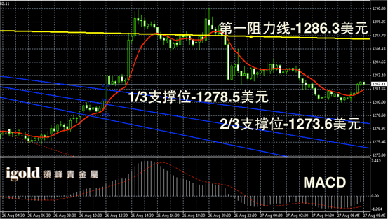 黄金阴阳烛录得回落后再次持稳反弹,阳烛录得增多,且小幅高于红色日均线,短线MACD显示呈中性,后期金价或不断向1285美元附近持稳。建议以1283美元线为参考,突破则偏于反弹,否则或继续围绕1282美元附近震荡。