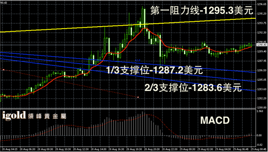 黄金阴阳烛录得反弹后,柱体收短,且小幅回落,柱体处于红色日均线中位,不过阳烛依然较多,短线MACD显示多头主导,上午金价或首先在1290美元附近处持稳,并可能再次向1293美元附近上探。