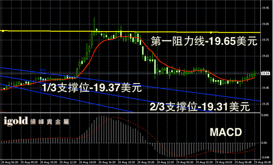 白银阴阳烛录得反弹后开始回落,后期柱体收短,且处于红色日均线中位,短线MACD显示呈中性,后期白银价格或小幅上探至19.6美元附近整理。