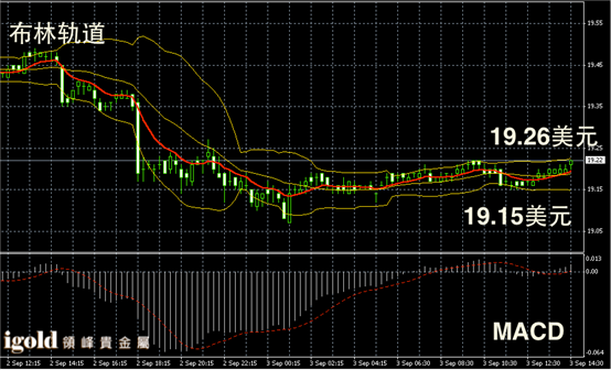 白银阴阳烛录得阳烛增多,不过仍然较短,柱体小幅低于红色日均线,布林轨道中线收平,短线MACD显示弱势多头主导,白银价格下午或继续在19.25美元附近持稳,并偏于向19.28美元附近攀升。