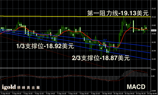 白银阴阳烛录得柱体较短,回落时浮动较小,末端柱体处于红色日均线中位,短线MACD显示呈中性,白银价格或继续围绕19美元整理,并小幅偏空。