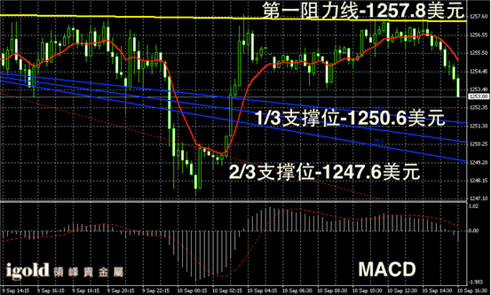 黄金阴阳烛录得末端阴烛连续出现,且低于红色日均线,短线MACD显示呈中性,晚上金价或不断下探测试低位支撑,若跌破1252美元则可能继续回落至1248美元附近,多头建议参考1258美元,未能突破前市场或偏于整理。