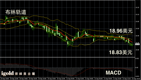 白银阴阳烛录得布林轨道下行,且末端录得阴烛低于红色日均线,短线MACD显示空头主导,白银价格跌破19美元支撑后,或继续小幅下探至18.86美元附近,随后或偏于持稳反弹。