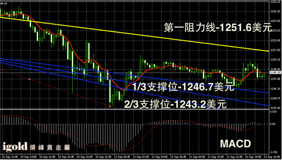 黄金阴阳烛录得柱体收短,末端高低交叉于红色日均线中位,短线MACD显示呈中性,黄金价格晚上或继续围绕1248美元附近整理,不过要留意美指攀升带来的下行压力。