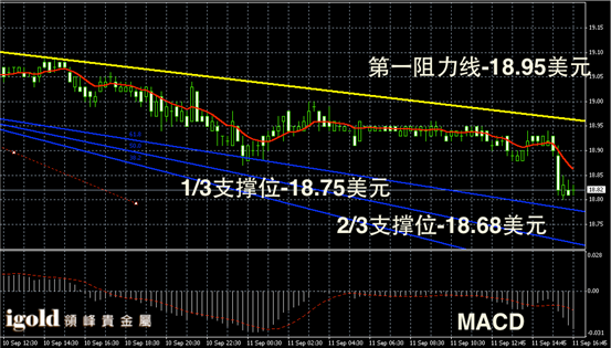 白银阴阳烛录得柱体低于红色日均线,短线MACD显示弱势空头主导,白银价格后期阳烛增多,晚上或小幅回调至18.9美元附近。