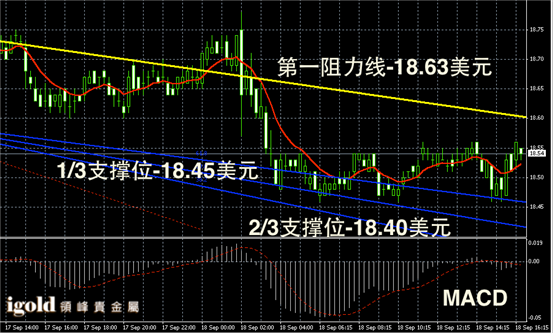 白银阴阳烛录得离散率较高,阴阳烛间隔出现,高低交叉于红色日均线中位,短线MACD显示呈中性,若白银价格突破18.56美元则可小幅看涨,否则市场或继续横盘运行。