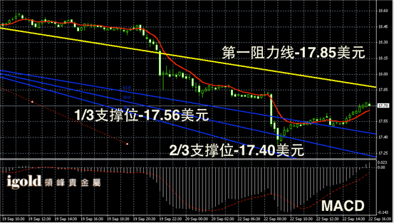 白银长线阴阳烛录得连续阴烛,且柱体大幅低于红色日均线,长线MACD显示空头主导,RSI录得17,严重超卖。白银价格跌破18美元后,新的下行轨道已经打开,未来若美指继续回落,白银价格可能回升至17.8美元附近,否则或继续下探。