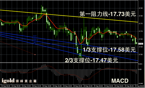 白银阴阳烛录得末端连续录得阴烛,且低于红色日均线,短线MACD显示弱势空头主导,白银价格或偏空运行,若跌破17.6美元则偏于向17.51美元附近滑落。