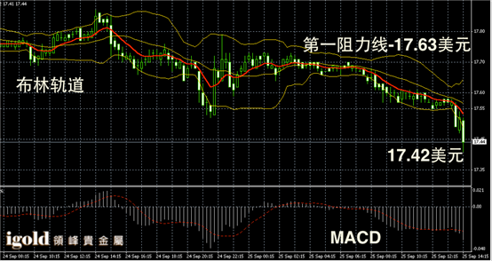 白银阴阳烛录得布林轨道小幅下探,且连续阴烛出现,低于红色日均线,短线MACD显示空头主导,白银价格下午若跌破17.40美元,则可能开启新的下行轨道,向17.3美元附近滑落。