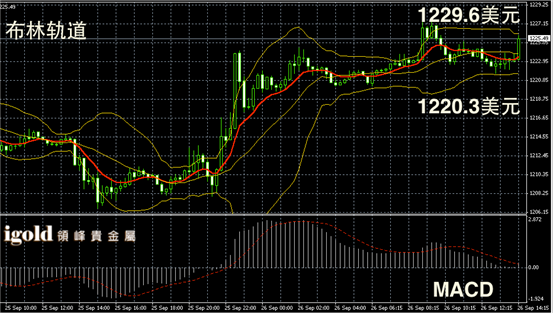 黄金阴阳烛录得高低交叉于红色日均线,短线MACD显示呈中性,布林轨道整体收平,下午金价若能突破1225美元,可能继续看涨至1228美元附近。否则或偏于区间调整。