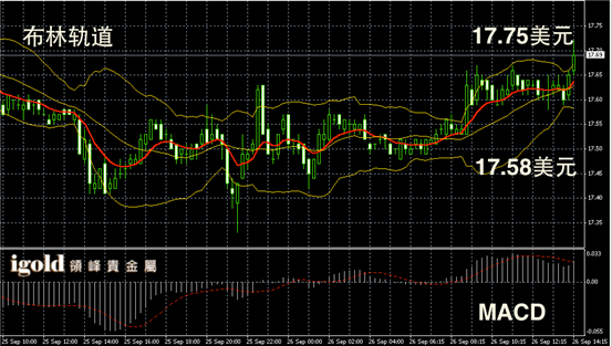 白银阴阳烛录得小幅攀升,不过离散率依然较高,短线MACD显示呈中性,白银价格下午或不断尝试突破17.7美元线。