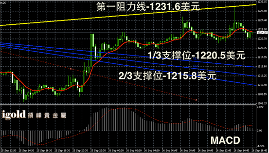 黄金阴阳烛录得高低交叉于红色日均线中位,且离散率增加,多空暂时平衡,短线MACD显示呈中性,晚上如果美指继续攀升,金价或承压测试1221美元,一旦跌破这一支撑或进而下行至1216美元附近,能否反弹建议参考1225美元线。