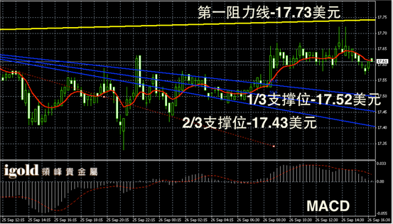 白银阴阳烛录得间隔出现,整体聚焦不明显,短线MACD显示呈中性,白银价格或继续围绕17.6美元上下整理,并且跟随美指波动进行逆向运行。