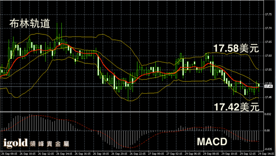 白银阴阳烛录得布林轨道小幅下探,柱体低于红色日均线,短线MACD显示呈中性,如果美指不继续攀升,白银价格下午或小幅持稳17.5美元附近。