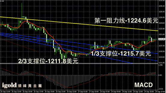 黄金阴阳烛录得高低交叉于红色日均线中位,短线MACD显示弱势多头主导,晚上金价短线或不断冲击1221美元附近,若不能突破或小幅回落至1217美元附近震荡。