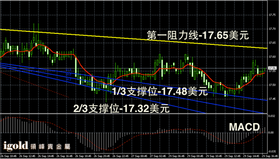 白银阴阳烛录得阴阳烛间隔出现,且高低交叉于红色日均线,短线MACD显示弱势多头主导,白银价格晚上持稳17.5美元后,或小幅上探17.6美元附近。若美指反弹,白银或继续回落。