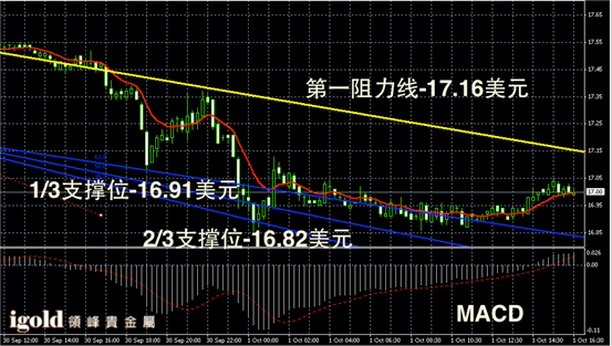 白银阴阳烛录得聚焦明显,柱体较短,整体处于红色日均线中位,短线MACD显示弱势多头主导,白银价格晚上或继续小幅上探17美元附近。