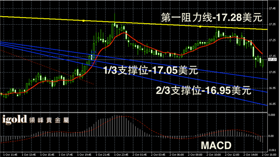 白银长线阴阳烛录得连续阴烛后阳烛小幅反弹,不过仍然低于红色日均线,且末端录得阴烛,长线MACD显示空头主导,RSI录得25,小幅反弹后回落,不过仍然处于超卖区间,白银价格新的下行轨道打开后,不断进行低位支撑探寻,短线市场或在17-17.2美元区间持稳。