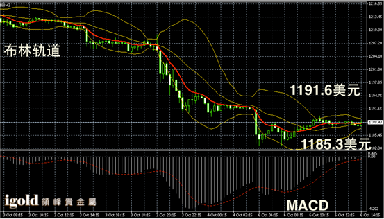 黄金阴阳烛录得布林轨道收窄,显示振幅较小,不过后期阳烛增多,短线MACD显示空头消散,黄金价格下午持稳1188美元后或向1191美元附近反弹,若跌破则偏于回落至1185美元附近。