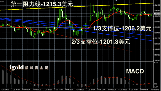 黄金阴阳烛录得波段震荡趋势明显,短线MACD显示呈中线,后期阳烛小幅增多,黄金价格若突破1213美元,则偏于向1215美元附近靠拢。整体运行区间可参考1209-1215美元。
