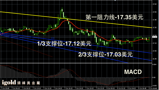 白银阴阳烛录得反弹后,小幅回落,后期阴阳烛间隔出现,短线MACD显示呈中线,白银价格或再次尝试突破17.3美元附近。美指若反弹,白银价格或再次承压。