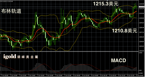 黄金阴阳烛录得柱体高于红色日均线,布林轨道小幅攀升,短线MACD显示弱势多头主导,黄金价格下午若不能突破1213美元,或继续围绕1211美元附近整理,若突破或攀升至1215美元附近。