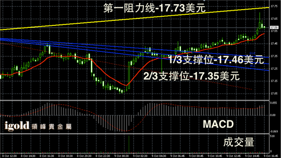 白银阴阳烛录得冲高后,连续阴烛,且触及红色日均线,短线MACD显示多头主导,白银价格晚上或小幅回落至17.5美元附近,美指若不断回调,白银价格或进一步回落至17.45美元附近。