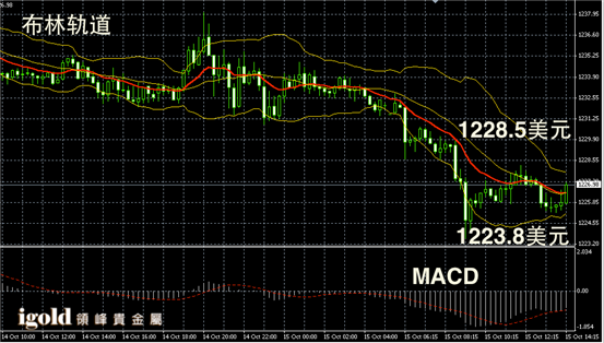 黄金阴阳烛录得布林轨道收平,且末端柱体逐渐回升至中线附近,短线MACD显示空头消散,黄金价格或在1226美元附近持稳,并可能小幅上探1228美元附近。